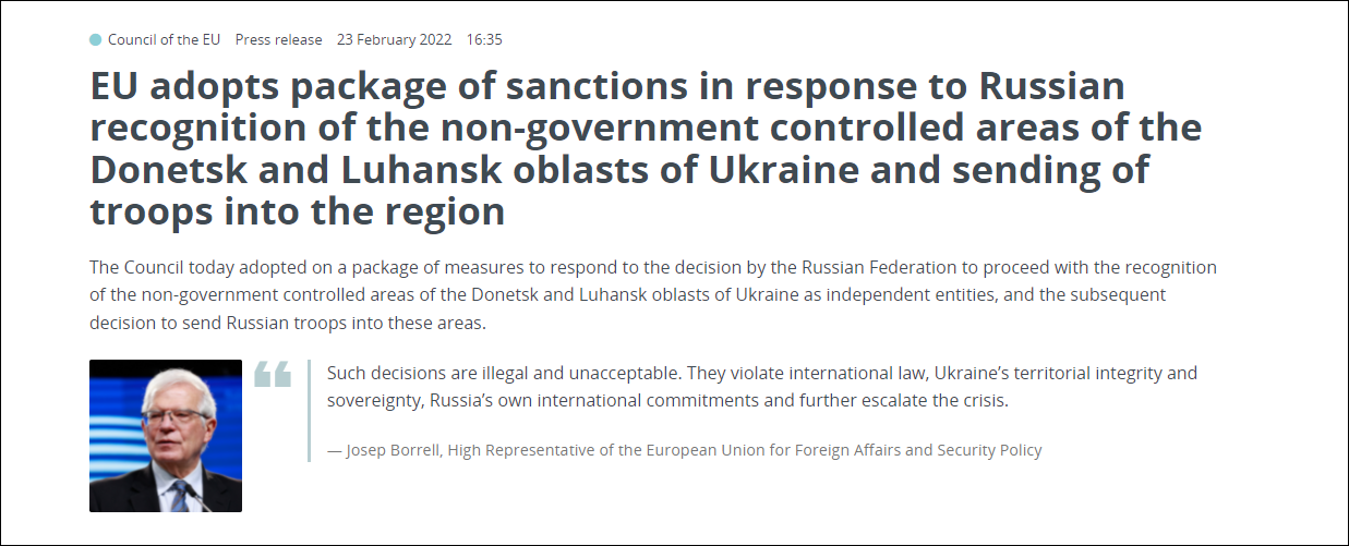 (观察者网讯)俄总统普京承认乌东地区独立后,当地时间2月23日,欧盟理事会正式通过一系列针对俄罗斯的制裁措施,并于23日正式生效。制裁措施针对俄国家杜马(联邦议会下院)的351名议员,以及27名个人和实体。相较美英,欧盟制裁范围更广,措施也更为严厉。
