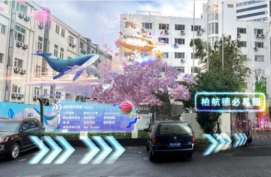 走进这个看似稀松平常的办公园区,一旦戴上AR眼镜或是打开手机,展现在眼前的便是永不迷路的主视角园区导览、24小时在线的AR大屏广告为入驻企业随时打CALL,还有浮于天空的北冥巨鲲、赛博朋克风的更新“建筑”和小彩蛋……