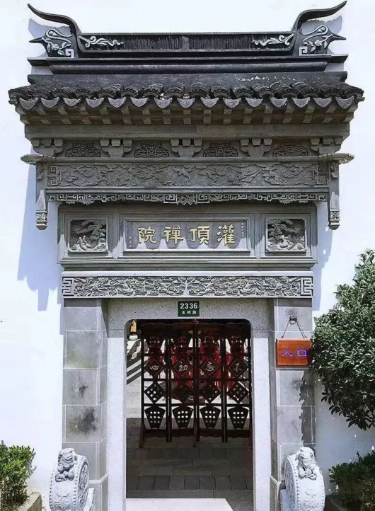 灌顶禅院为一座苏州园林风格的寺院,在山门的装饰上采用了我国古建筑的砖雕形式,与寺院的整体风格相融合。上面雕有蝙蝠、梅花鹿、灵芝、松树等图案,寓意“福禄康寿”。