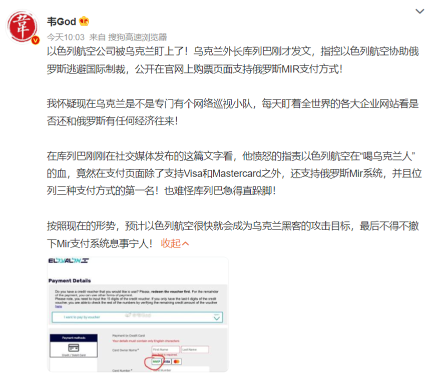 事件背景3月8日,有微博网友发文表示,“以色列航空公司被乌克兰盯上了。”以航“支持俄罗斯Mir支付系统,并且位列支付方式的第一名”。