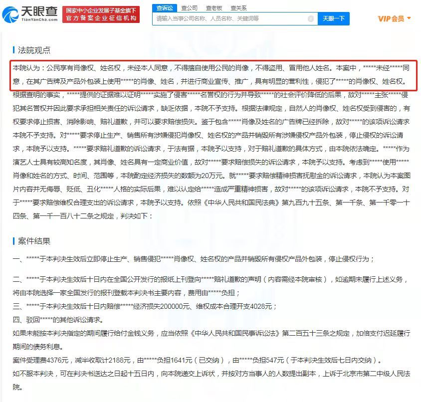 法院审理认为,被告擅自在其广告牌及产品外包装上使用原告肖像、姓名,并进行商业宣传、推广,侵犯了原告肖像权、姓名权。最终,法院判决被告停止生产、销售侵权产品,向原告公开道歉并赔偿20.4万余元。