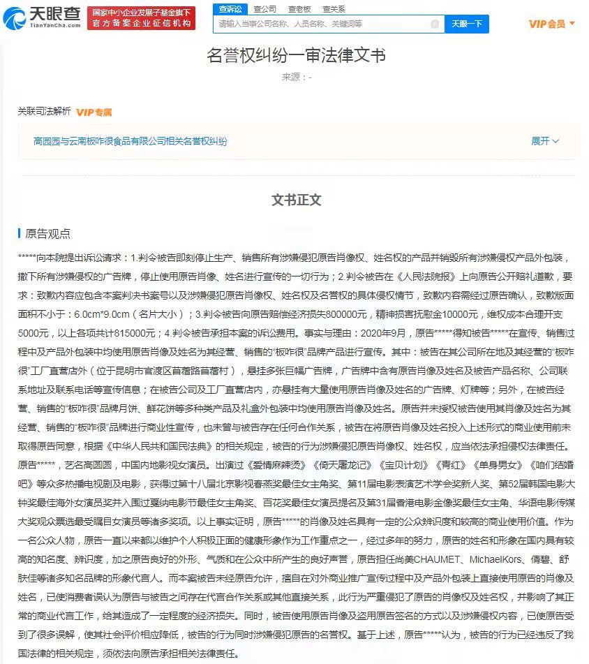 3月10日,据天眼查App显示,高园园(高圆圆)与云南板咋很食品有限公司名誉权纠纷一审法律文书公开。