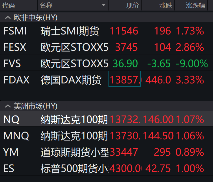 美股三大股指期货涨约1%,欧股三大股指均涨超1.5%