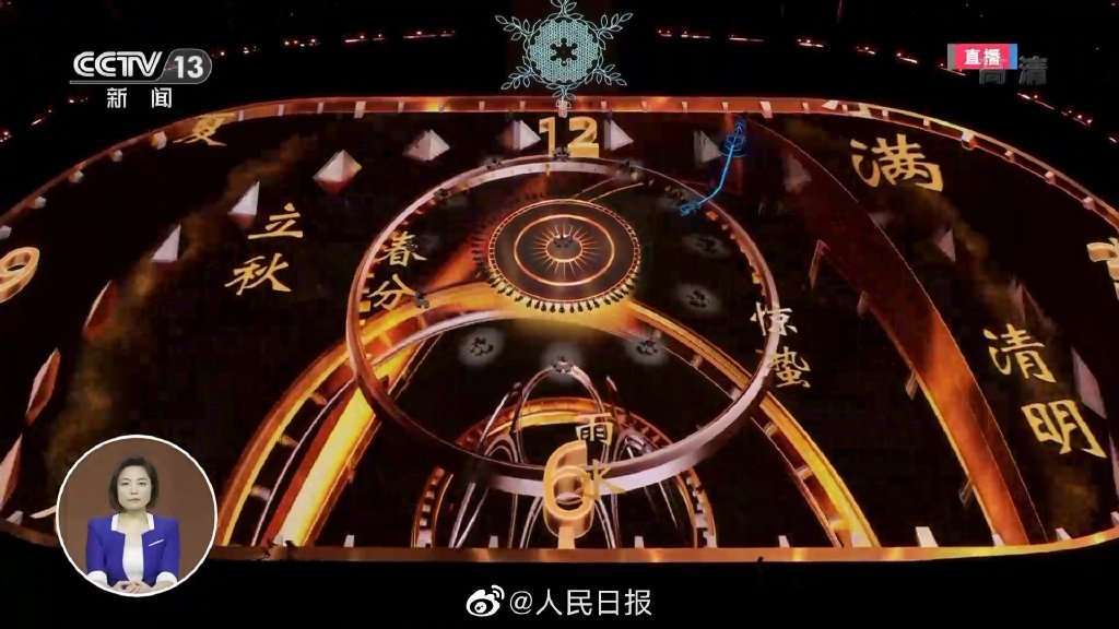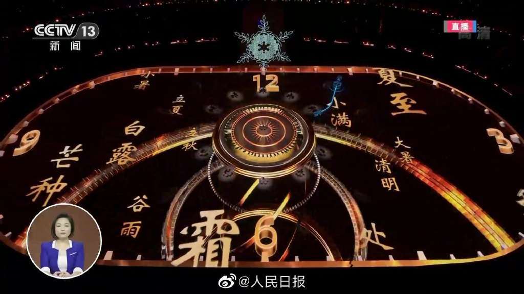 在由定音鼓构成的“表盘”形象上,60名残健共融的表演者用行为模拟着“指针”每圈60个时间刻度的行进轨迹。从中国传统的天干地支时辰和二十四节气、到世界通用的象征时间概念的符号,都随着时间的轨迹应运而生。