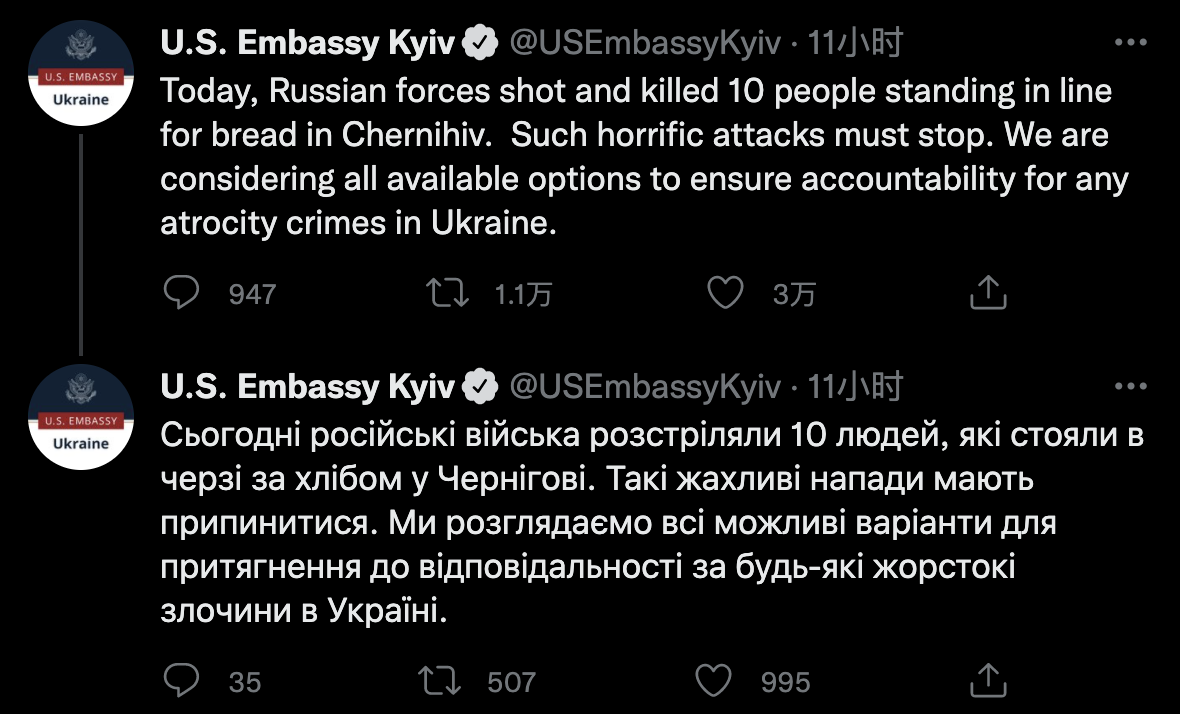 针对乌方指责俄军战争罪行的行为,科纳申科夫反驳了一条被美国驻乌使馆转载的消息。这是一段网传俄军在切尔尼戈夫市区内枪毙排队领面包平民的视频,科纳申科夫指出,俄军仅将通往该市的道路封闭,未曾进入过切尔尼戈夫市区,从视频里也看不到交战过的迹象,建筑门窗完好无损。科纳申科夫称,这些平民被害皆为乌克兰民族主义者所致。