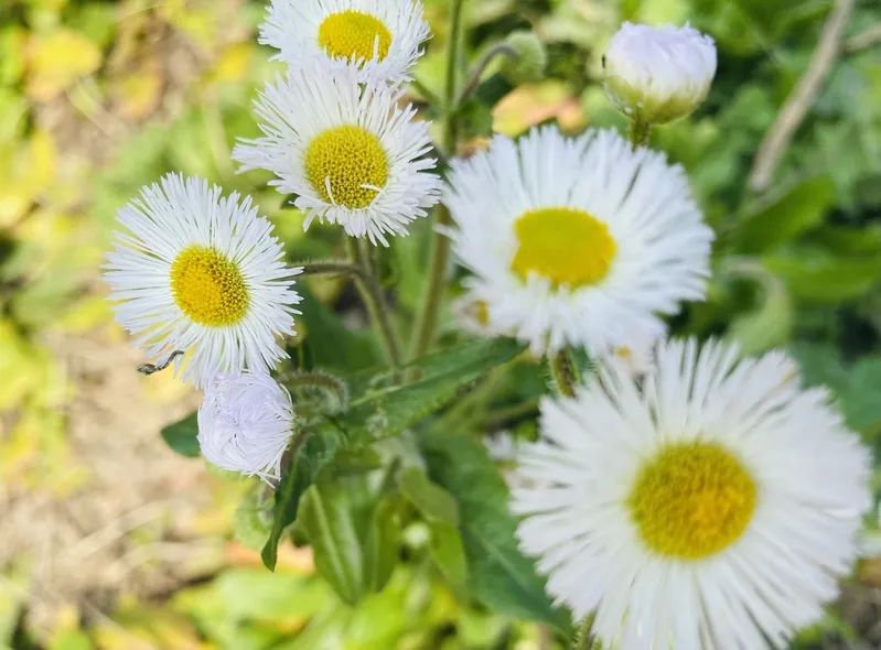 一年蓬也是郊区常见的路边小花,属一年生或越年(二年)生草本,茎直立,上部有分枝,全株被上曲的短硬毛。一年蓬全草可入药,味甘、苦,性凉。可消食止泻,清热解毒。