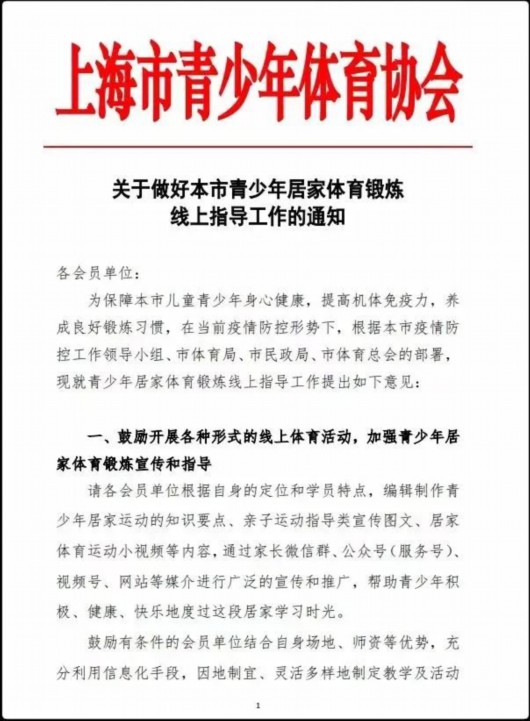 上海市青少年体育协会积极响应疫情防控要求,向全体会员单位下发《关于做好本市青少年居家体育锻炼线上指导工作的通知》,发动会员单位做好居家体育锻炼宣传,积极开展青少年体育线上教学和比赛等活动。同时,协会开发了家长公益课堂系列在线课程,面向社会免费开放,为全市家长送上公益体育课程福利。