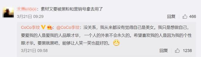 从李玟晒出的素颜自拍照来看,她的脸周和下巴都有明显的皱褶,颈纹也是一览无遗,评论区中有网友表示:“素材又要被黑粉和营销号拿去用了”,而李玟则霸气回应:“要黑就黑吧,能够让人笑一笑也挺好的”,更坦言自己“从来都没觉得自己是美女”。