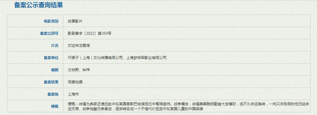3月22日,国家电影局发布关于2022年1月全国电影剧本(梗概)备案、立项公示的通知。其中,由文牧野、钟伟编剧的新片《欢迎来到龙餐馆》正式立项,获准拍摄。影片的备案公司显示为坏猴子(上海)文化传播有限公司、上海梦将军影业有限公司。
