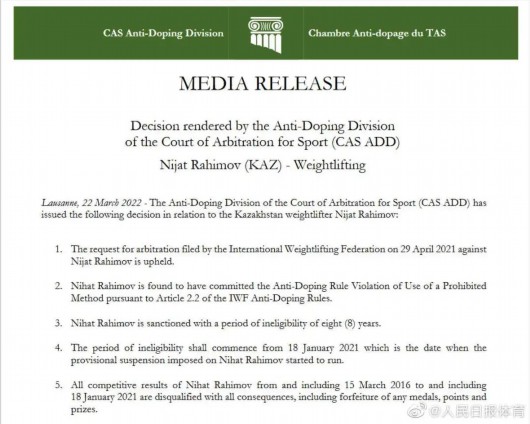 里约奥运会男子举重77公斤级冠军由尼德札特·拉希莫夫获得,但如今国际体育仲裁法庭宣布,尼德札特·拉希莫夫因使用禁药将被禁赛8年。同时,他从2016年3月15日到2021年1月18日的所有比赛成绩被取消。这意味着中国名将吕小军将递补获得里约奥运会该级别金牌,从而实现奥运会三连冠。