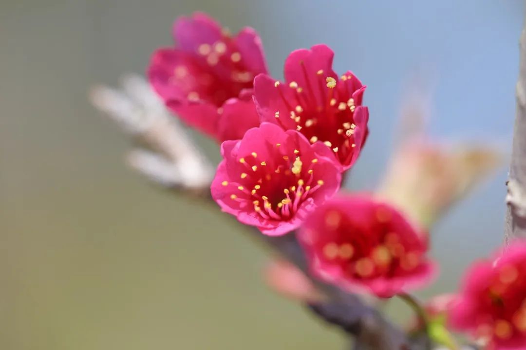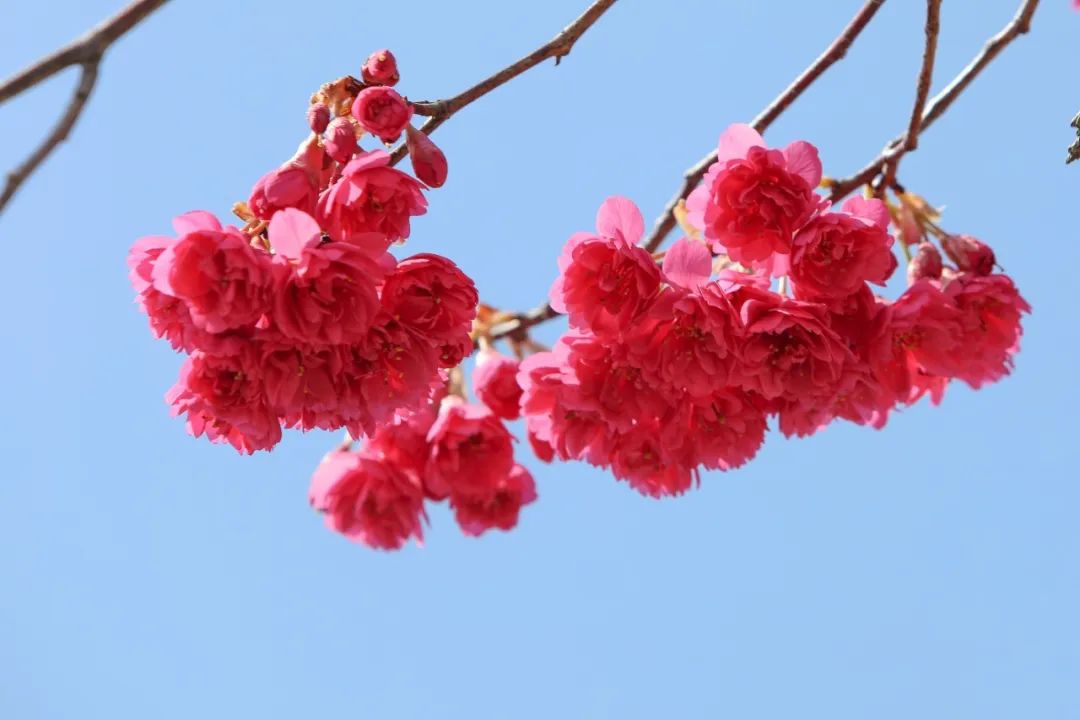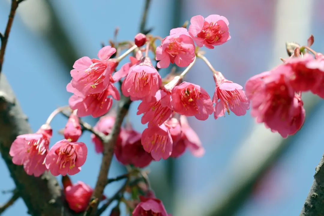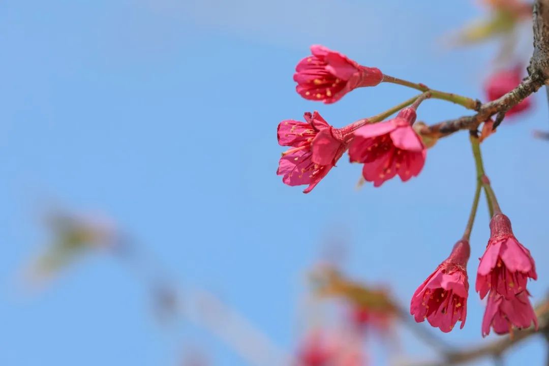 映入眼前的其实是樱花,学名“寒绯樱”,也叫“山樱花”。寒绯樱开花时花瓣朝下呈吊钟状,花色鲜艳亮丽,枝叶繁茂旺盛。