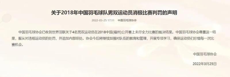 “中国羽毛球协会已收到世界羽联关于4名男双运动员在2018中国(福州)公开赛上未尽全力比赛的裁决结果。中国羽毛球协会尊重这一结果,服从对违规运动员的处罚,并追加内部惩处。”