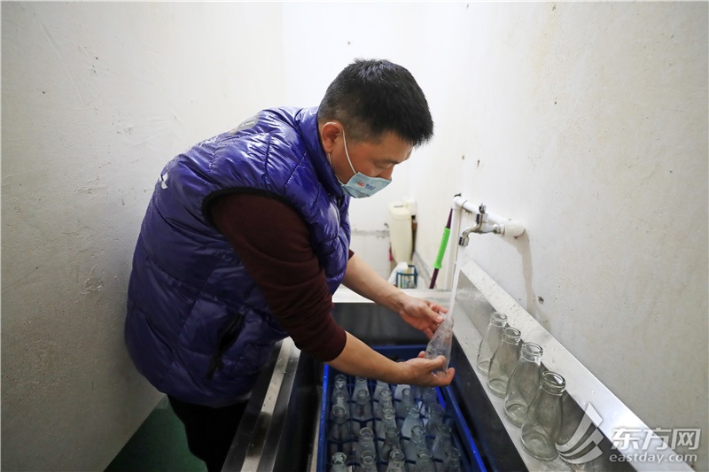 ▼柳魁初步冲洗回收来的空奶瓶,这些空奶瓶回收进厂后还会进行深度清洁消毒。