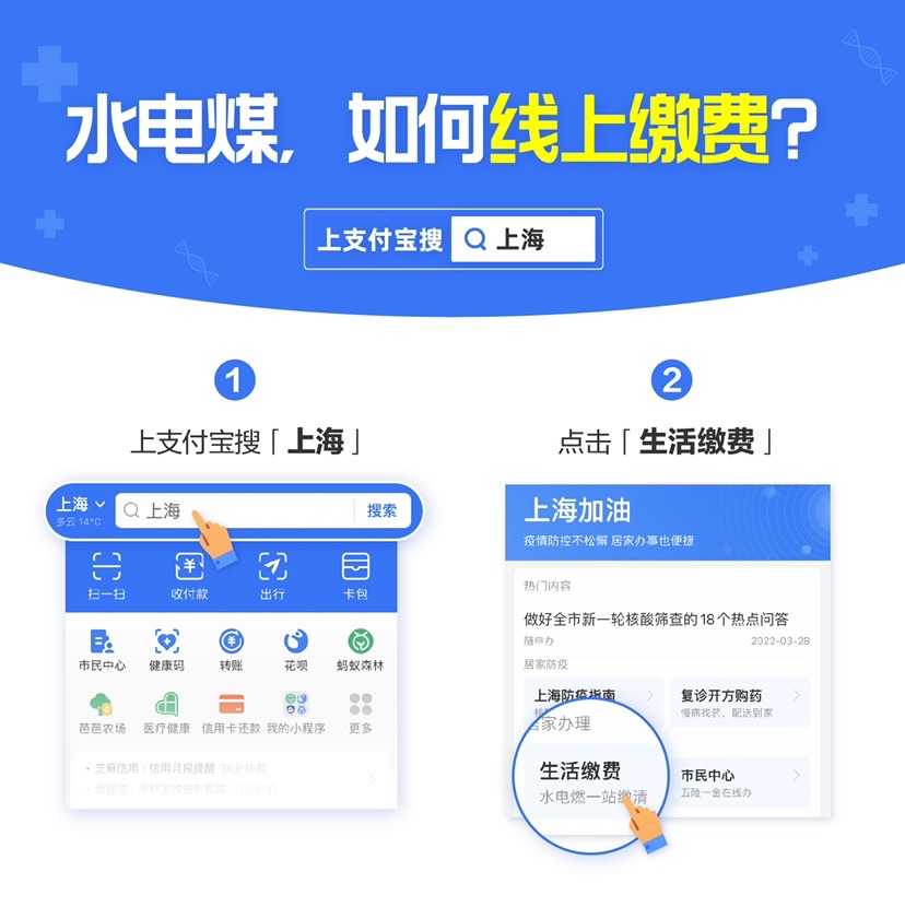 在封闭管控阶段,遇到需要支付的水电煤账单也可以使用支付宝线上缴费功能,绑定账户后,即可一键支付。