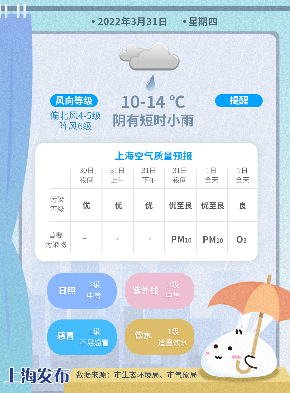 另外受冷暖空气共同影响,申城今天半夜起阴有时有阵雨,南部地区有短时雷雨,明天白天阴有短时小雨,夜里转阴到多云,偏北风4~5级阵风6级,气温大幅下降,在10~14度,还请大家及时增减衣物,谨防感冒。