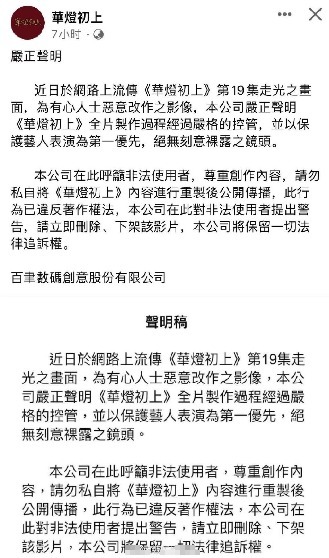 同时,声明称“全片制作过程管控严格,把保护艺人的表演放在了首位,绝对没有刻意裸露的镜头。”最后,声明中对非法使用者提出警告,“请立即删除、下架该影片,保留一切法律追诉权”。