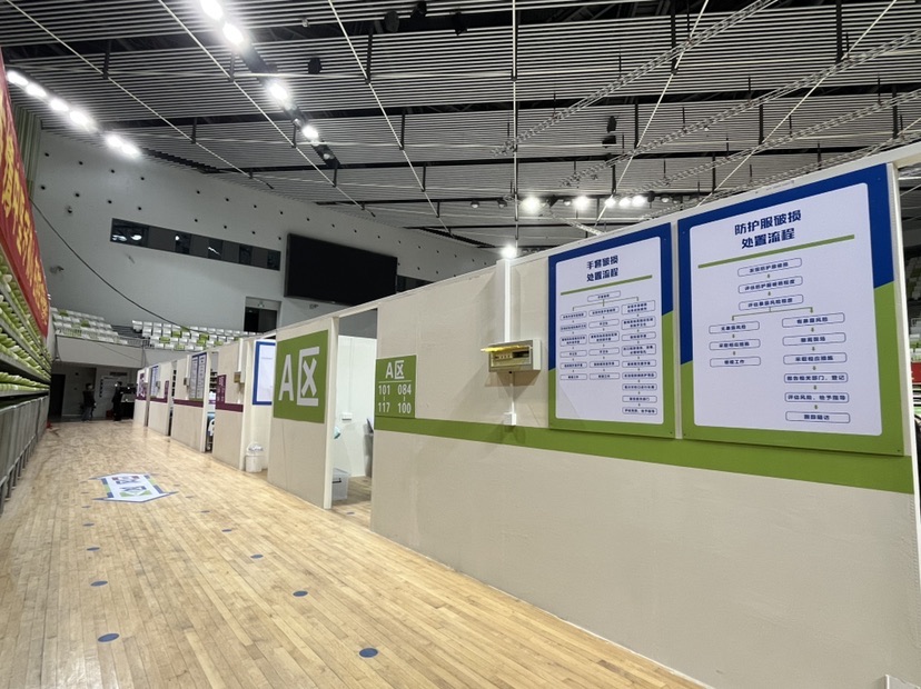 据了解,新启用的青浦区方舱医院设在青浦区体育文化活动中心,总建筑面积为30878平方米,设有500张床位,使用地上1-2层,按标准开设呼吸内科、急诊、外科、儿科和中医科。护理病区设置了7个护理单元,有3个抢救区域。院内配备方舱CT、无创及有创呼吸机、除颤仪、心电图机、可视喉镜和过氧化氢消毒机等医疗设备。生活区内集中设置了淋浴区、盥洗区和饮用水净水系统。每床位配备被褥、床头灯、床头柜和应急呼叫器等辅助设备及拖鞋、毛巾、牙刷、牙膏和卫生纸等生活用品。
