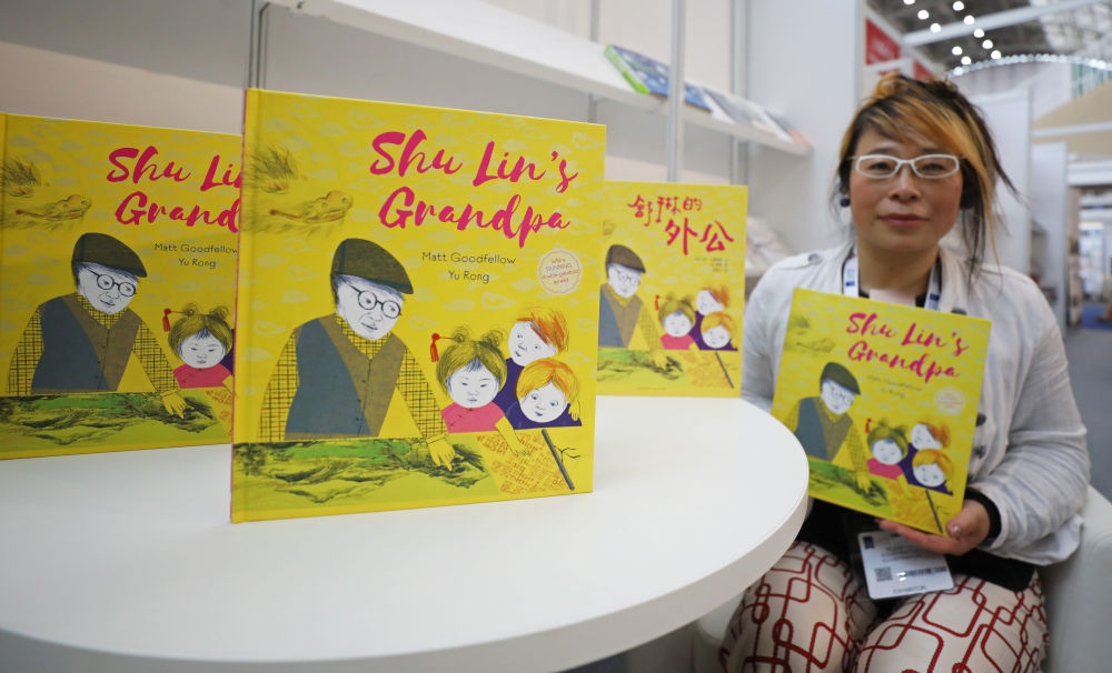 4月5日,在英国伦敦书展上,郁蓉展示儿童绘本《舒琳的外公》。(新华社记者李颖摄)