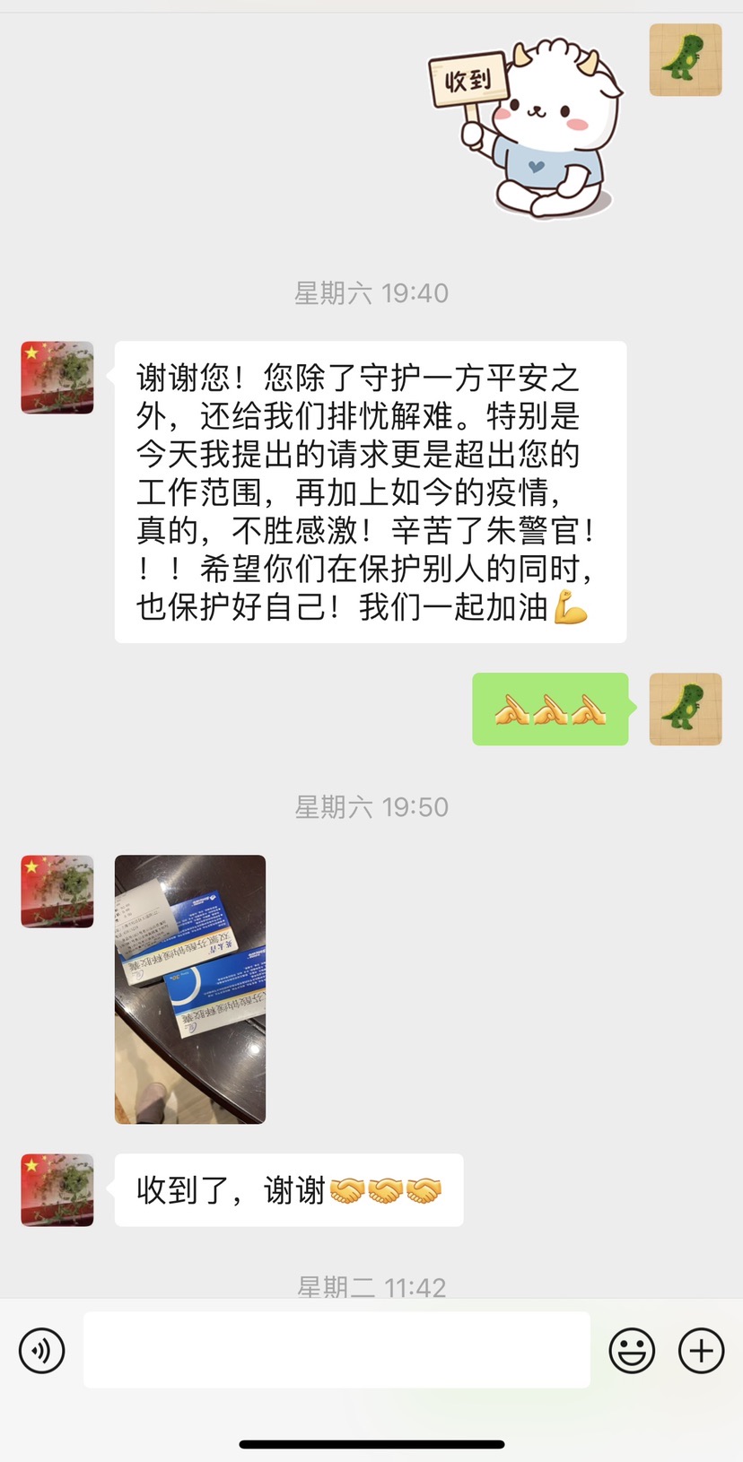 小区居民之所以能够及时联系上朱大坚,主要源于3月31日小区业主微信群里的一则信息——大家这几天如果急需药品可以在群里联系我。这则信息的末尾特意留下了手机号码。“当时担心封控这几天,居民不方便买药。” 朱大坚说,特殊时期,作为一名人民警察,为群众排忧解难责无旁贷。