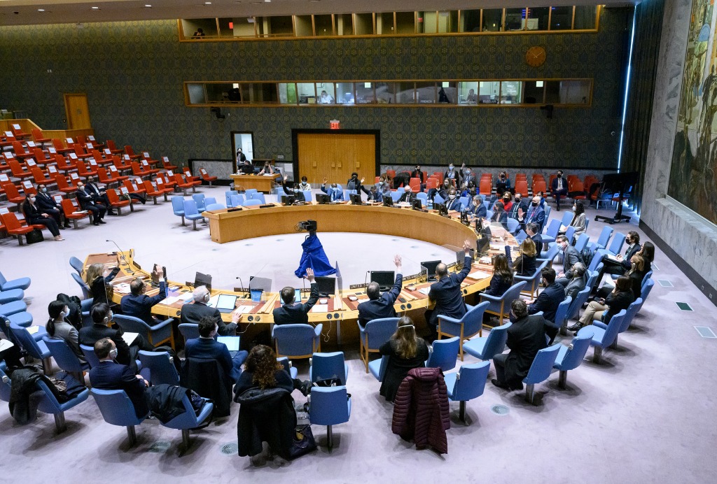 2月28日,在位于纽约的联合国总部,联合国安理会对决议进行表决。联合国安理会当日通过第2624号决议,决定对也门胡塞武装实施武器禁运。这是安理会首次将胡塞武装作为实体列入武器禁运制裁范围。新华社发(联合国供图/洛伊·费利普摄)
