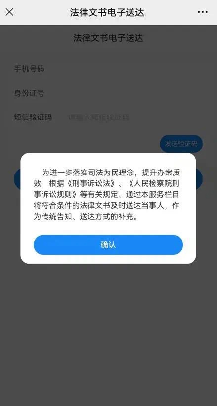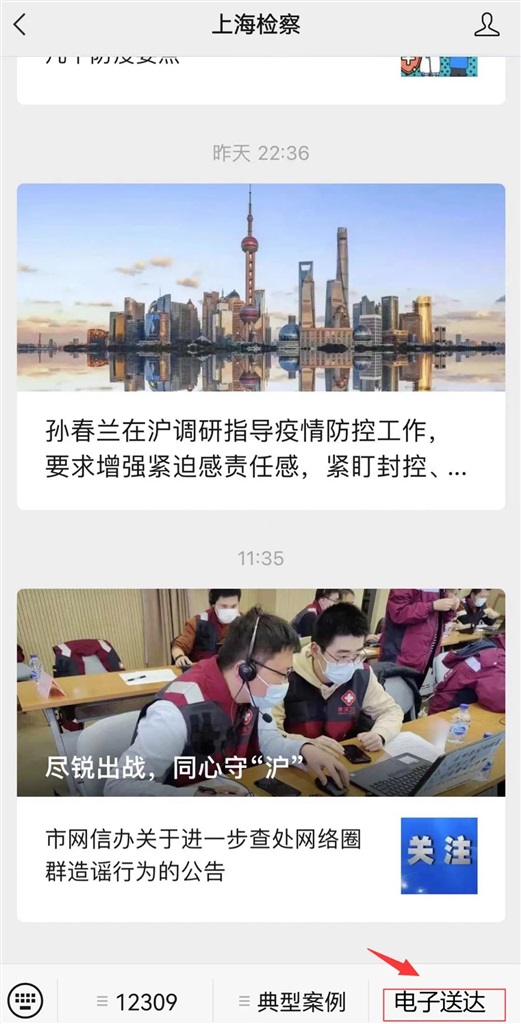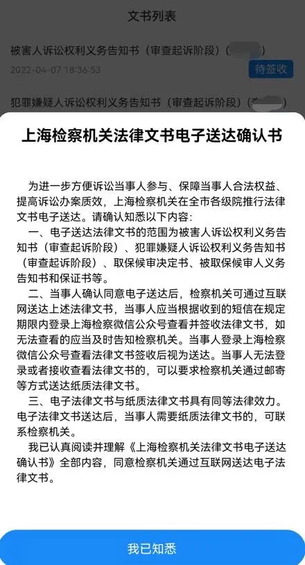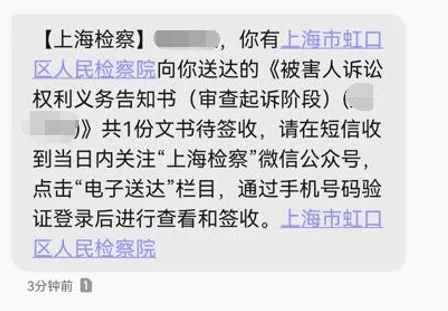 东方网记者包永婷4月9日报道:“你有一份文书待签收,请通过手机号码验证登录后进行查看和签收!”随着“叮!”的一声短信提醒,盗窃案被害人小王(化名)在手机上收到了上海市虹口区人民检察院在线上电子送达的《被害人诉讼权利义务告知书(审查起诉阶段)》。 经过虹口区检察院前期试点,今天(4月9日),上海市人民检察院在全市推开法律文书电子送达工作,通过“减流动、减环节、减时间、减材料”,确保当事人足不出户即可收到法律文书,保障其法定权利。 “这个服务很方便,从接收到签收,只需要十来分钟。”受送达人、案件被害人小王表示,收到法律文书待接收提醒短信后,只需按照指引,就能在手机端查询浏览法律文书,进行电子签名、确认完成签收。 今年2月,市检察院印发了上海检察全流程全息在线办案综合平台总体规划。此次上线的法律文书电子送达功能系该平台建设过程中场景可延展的典型。 根据工作指引,现阶段电子送达主要适用于被害人诉讼权利义务告知书(审查起诉阶段),犯罪嫌疑人诉讼权利义务告知书(审查起诉阶段),取保候审决定书和被取保候审人义务告知书等四类文书;为充分保障当事人的选择权,明确检察机关应当在电子送达前致电受送达人,就其身份信息、联系方式、是否同意采用电子送达方式、是否具备电子送达条件等进行确认;受送达人首次登录时还会收到一份上海检察机关法律文书电子送达确认书,知悉电子送达法律文书的类型和法律效力等重要申明内容,以保障当事人的知情权。 附法律文书电子送达流程示意图 第一步,受送达人收到“上海检察”短信网关发送的法律文书待接收提醒短信,按照短信提醒的指引,微信登陆“上海检察”公众号选择“电子送达”服务。
