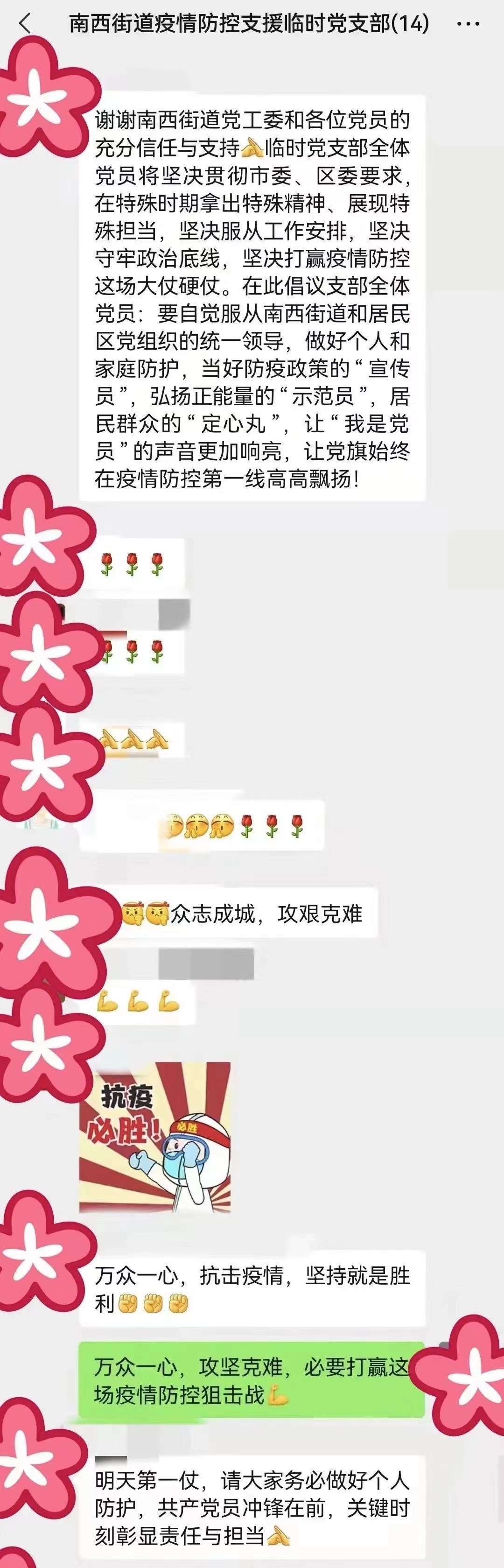 疫情就是命令,防控就是责任。在这场即将打响的疫情防控战前夕,作为机关下沉支援基层的区社会工作党委副书记蒋燕被任命为临时党支部书记,她第一时间发出倡议:在职党员要自觉服从南西街道和居民区党组织的统一领导,做好个人和家庭防护,当好防疫政策的“宣传员”,弘扬正能量的“示范员”,居民群众的“定心丸”,让“我是党员”的声音更加响亮,让党旗始终在疫情防控第一线高高飘扬!