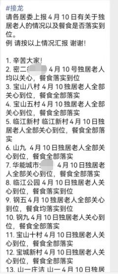 “#接龙,请居委上报4月10日有关独居老人情况以及餐食是否落实到位……”这是“友谊民政”微信群里每天都会进行的固定操作,让每一个辖区独居老人都在街道、居委会的关爱下度过难关,这也是落实对特殊人群关心关爱的关键措施之一。