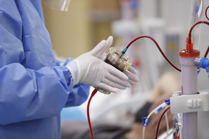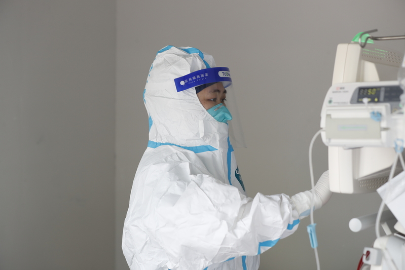 在应急血透室工作时,医护人员要实行三级防护,完成血透情况观察、更换置换液等一系列工作,一直陪伴患者4-6个小时。