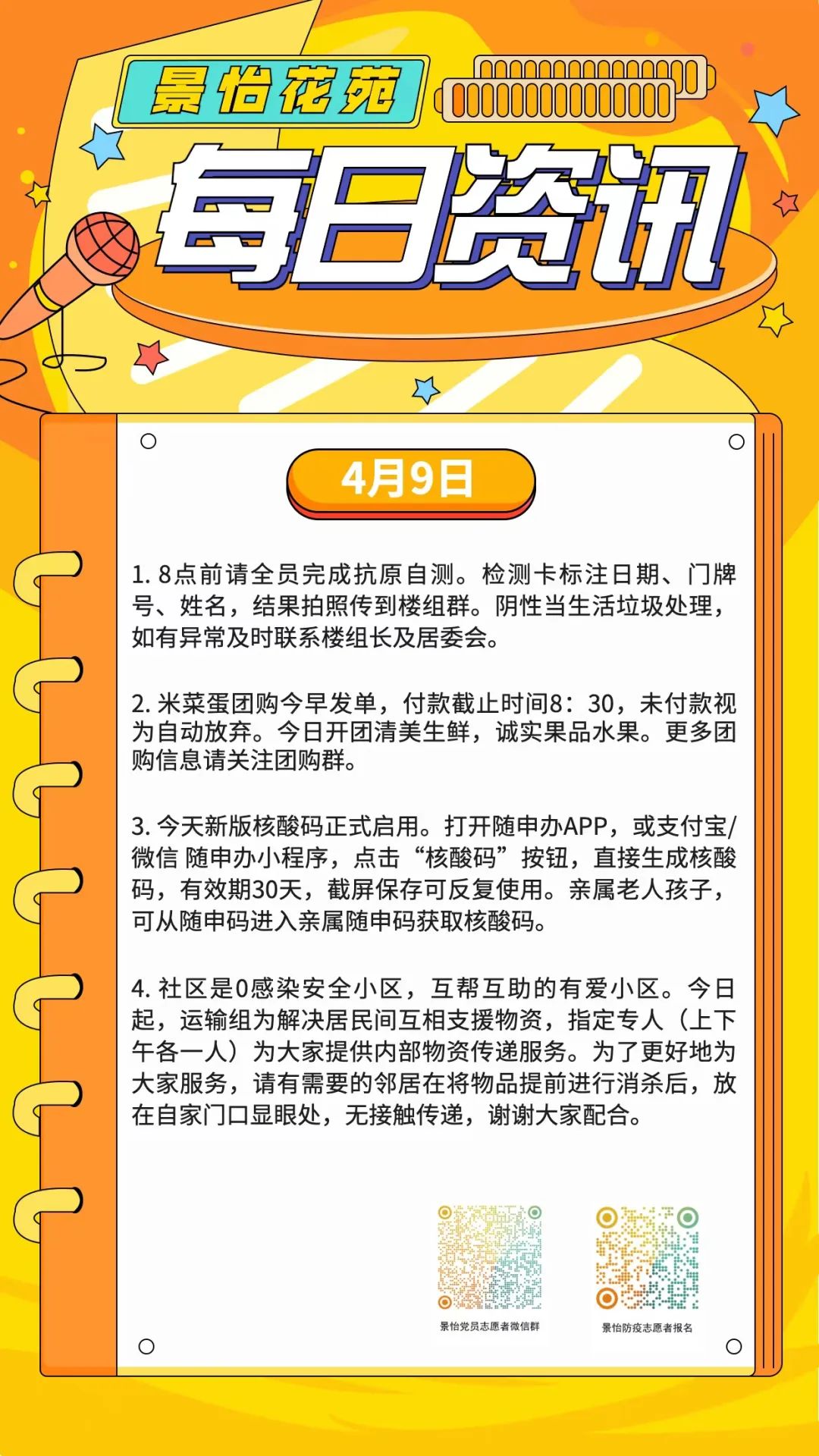 “8点前请全员完成抗原自测,检测卡标注日期、门牌号、姓名,结果拍照传到楼组群”“米菜蛋团购今早发单,付款截止时间8:30,未付款视为自动放弃”“今天新版核酸码正式启用,有效期30天,截屏保存可反复使用”……通读第一期(4月9日)的小报可以看到,不仅信息实用丰富、简明扼要,而且设计清晰明了。