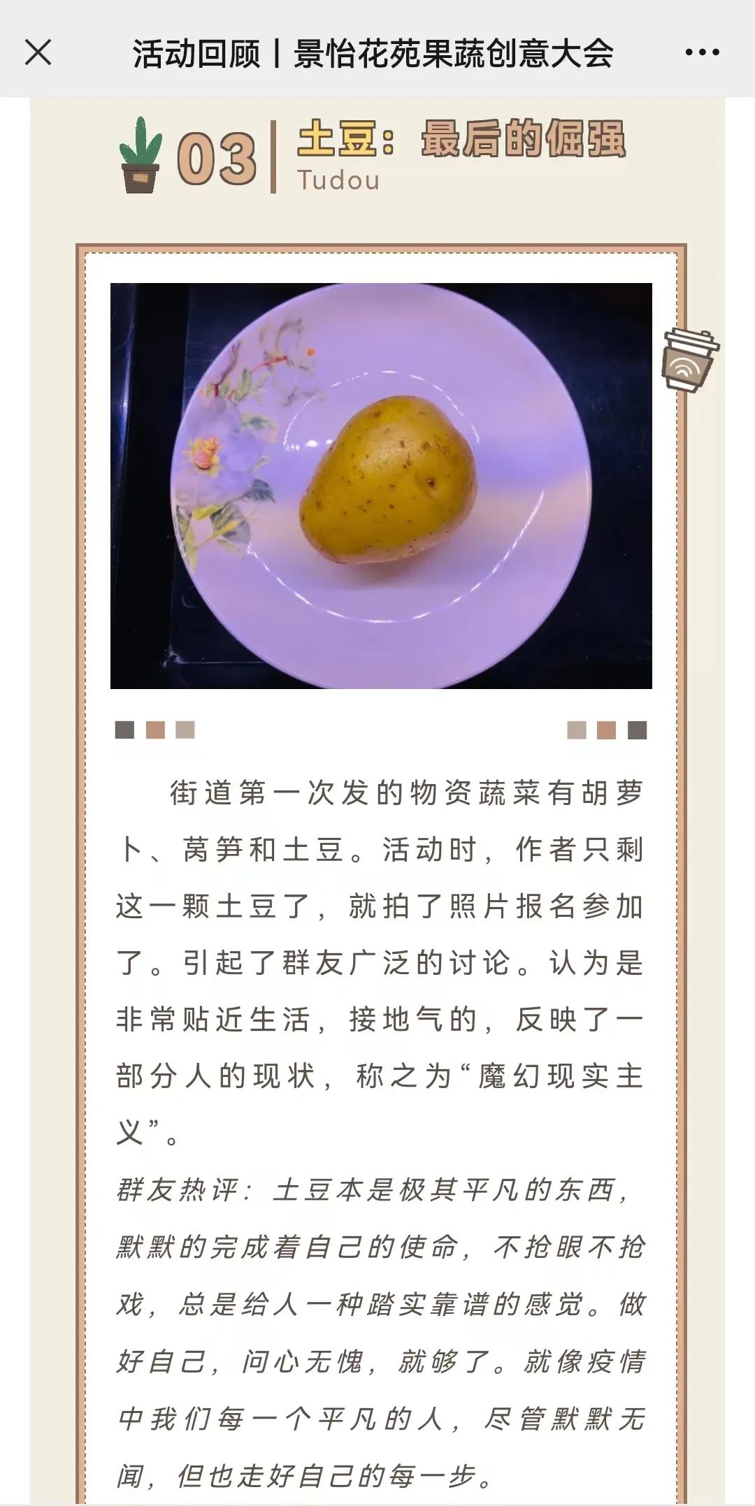 除了数据更新和工作动态播报,小报的温馨有趣也是居民们津津乐道的地方。在4月13日的今日早讯上,“家庭果蔬创意大会”的字眼让封控多日的居民不禁跃跃欲试,大家纷纷投稿报名。在4月15日的活动回顾里,“蔬果也疯狂,爱拼才会赢”的主题在大家诙谐有趣、才艺尽显的作品中体现得淋漓尽致,成了焦虑生活中的舒缓剂。