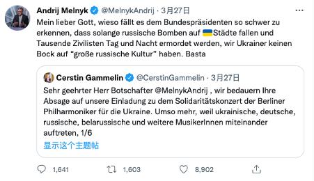 同日,作为对斯泰因迈尔发言人瑟斯汀·加梅林(Cerstin Gammelin)的回应,他继续在推特上表示,“我们乌克兰人没有心情欣赏‘伟大的俄罗斯文化’。”