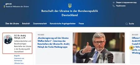 截至4月18日,乌克兰驻德国大使馆官方网站仍旧显示,安德烈·梅尔尼克担任乌克兰驻德大使。但是,自今年1月10日后,乌大使馆就暂停更新相关新闻。