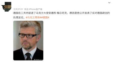 近日,微博上流传一则消息称:“德国在三天内驱逐了乌克兰大使安德烈·梅尔尼克,原因是他公开发表了反对德国政治的仇恨言论。”