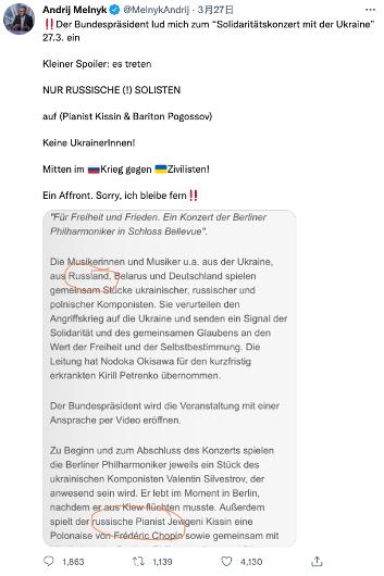 3月,施泰因迈尔组织了“声援乌克兰”音乐会。3月27日,梅尔尼克在推特上发帖表示,由于这次音乐会的单人表演者包含俄罗斯钢琴家基辛(Kissin)和男中音波戈索夫(Pogossov),而不包括乌克兰音乐家,自己将不会出席这次音乐会。