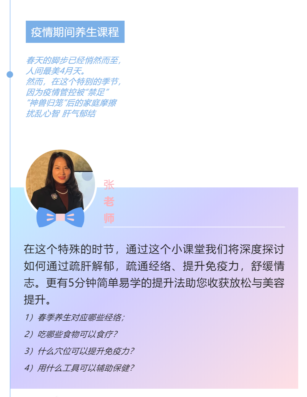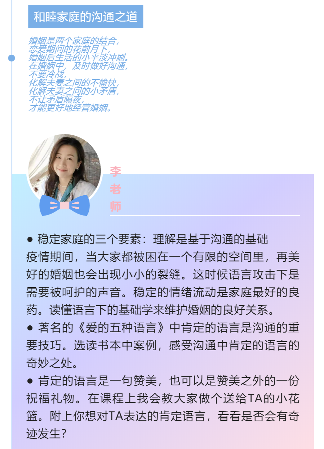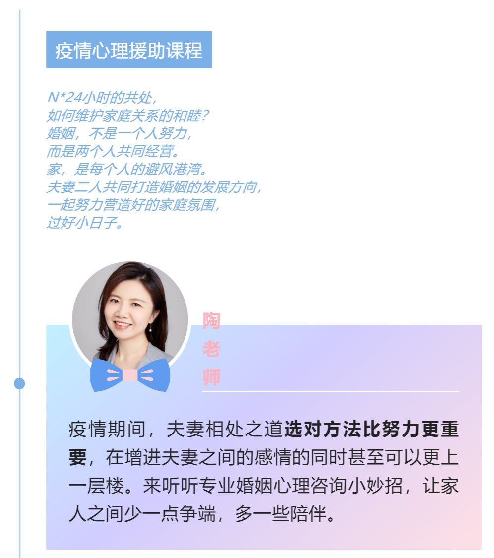 上海馨享社区公益服务中心邀请婚姻咨询和养生专家定制“疫期”坚守,隔离不隔爱的婚姻系列云端课堂,从家庭沟通技巧、婚姻生活日常争端处理、疫情期间养生保健等方面提供专业辅导。