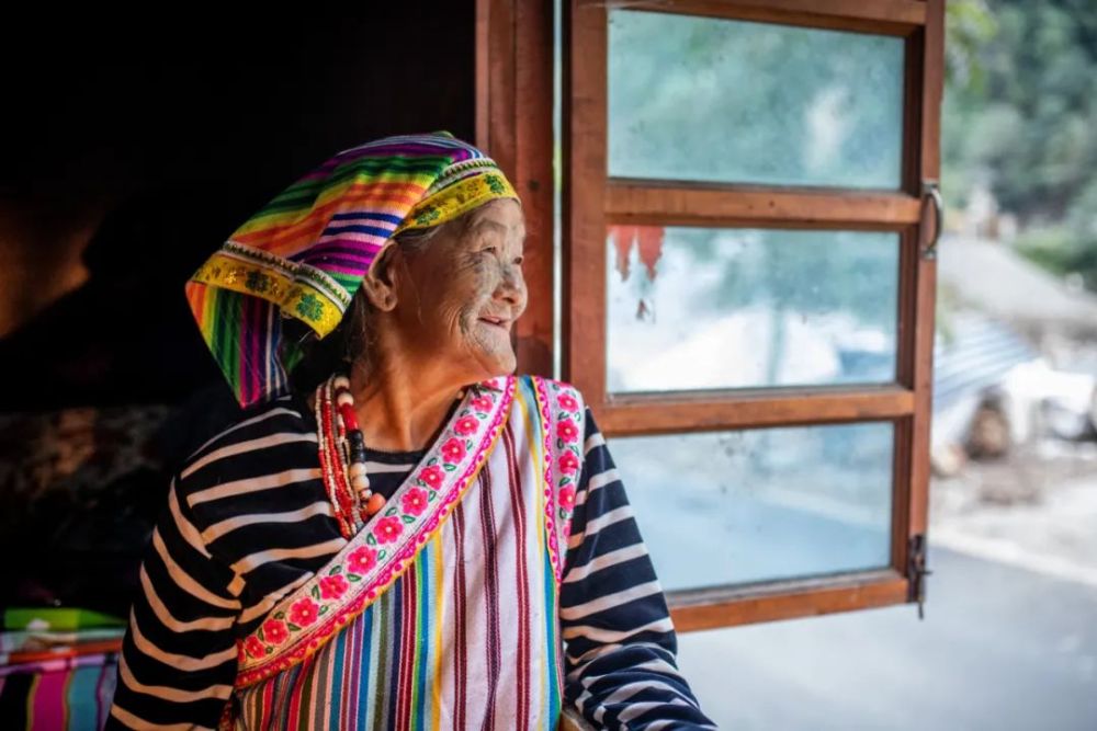 2020年10月27日,云南省贡山独龙族怒族自治县独龙江乡孔当村,独龙族“文面女”李文仕在窗边休息胡超摄/ 本刊