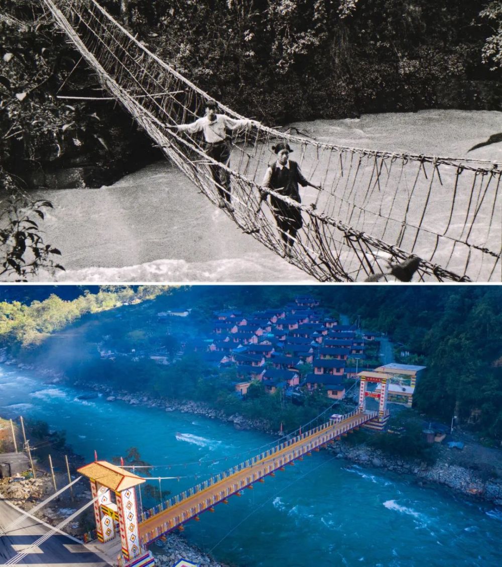 上图:独龙族群众通过藤篾桥,这样的桥一直沿用到独龙江索改桥和公路桥通行以后(资料照片);下图:独龙江乡2020年10月中旬建成通车的白来感恩大桥胡超摄/ 本刊