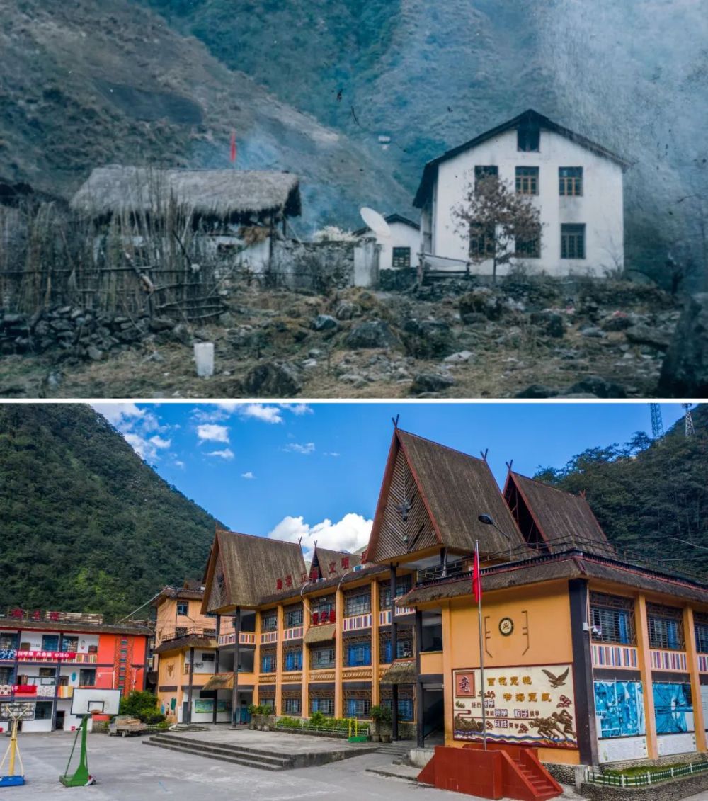 上图:曾经的独龙江乡中心学校(资料照片);下图:崭新的独龙江中心学校教学楼(2020年10月28日摄)胡超摄/ 本刊