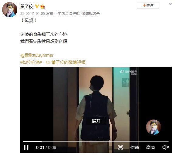 5月11日凌晨,黄子佼在个人社交平台晒出一段视频,视频中是孕妻孟耿如的背影,背景音有心跳声。他发文称:“!母亲!老婆的背影与玉米的心跳,我们看完影片只想到企鹅。”