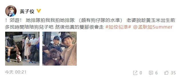 自从结婚后,黄子佼就经常在社交平台分享与爱妻的恩爱日常。4月6日凌晨,黄子佼在个人社交平台晒出两张郊游照并配文称:“郊游!她排队拍我我拍她排队(颇有狗仔队的水准)老婆说趁黄玉米出生前,多找时间陪陪狗儿子吧!然后他真的双脚很会走。”