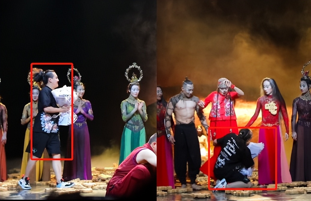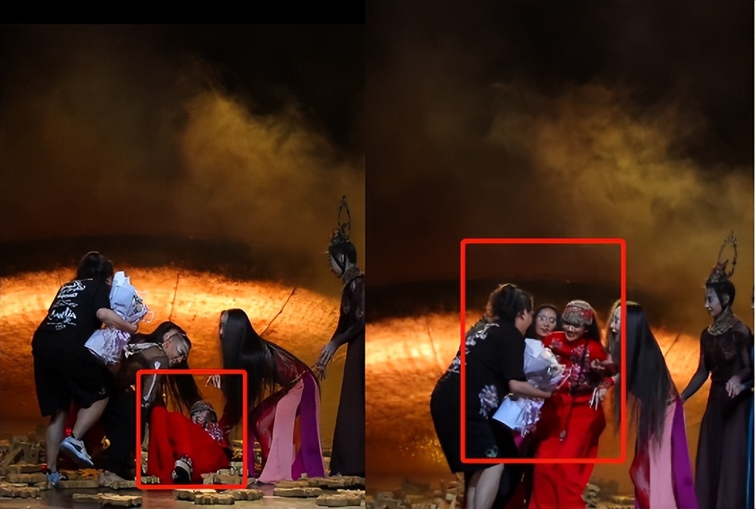 在最后的展示结束之后,有个胖胖的粉丝抱着一束花,兴高采烈地走上了舞台,准备把这束花献给杨丽萍。不知道是不是见到杨丽萍太激动了,粉丝在快要见到杨丽萍的时候脚下一个踉跄,直接摔在了杨丽萍的脚下,同时他一把扶住了杨丽萍的腿,却把杨丽萍也带倒了。