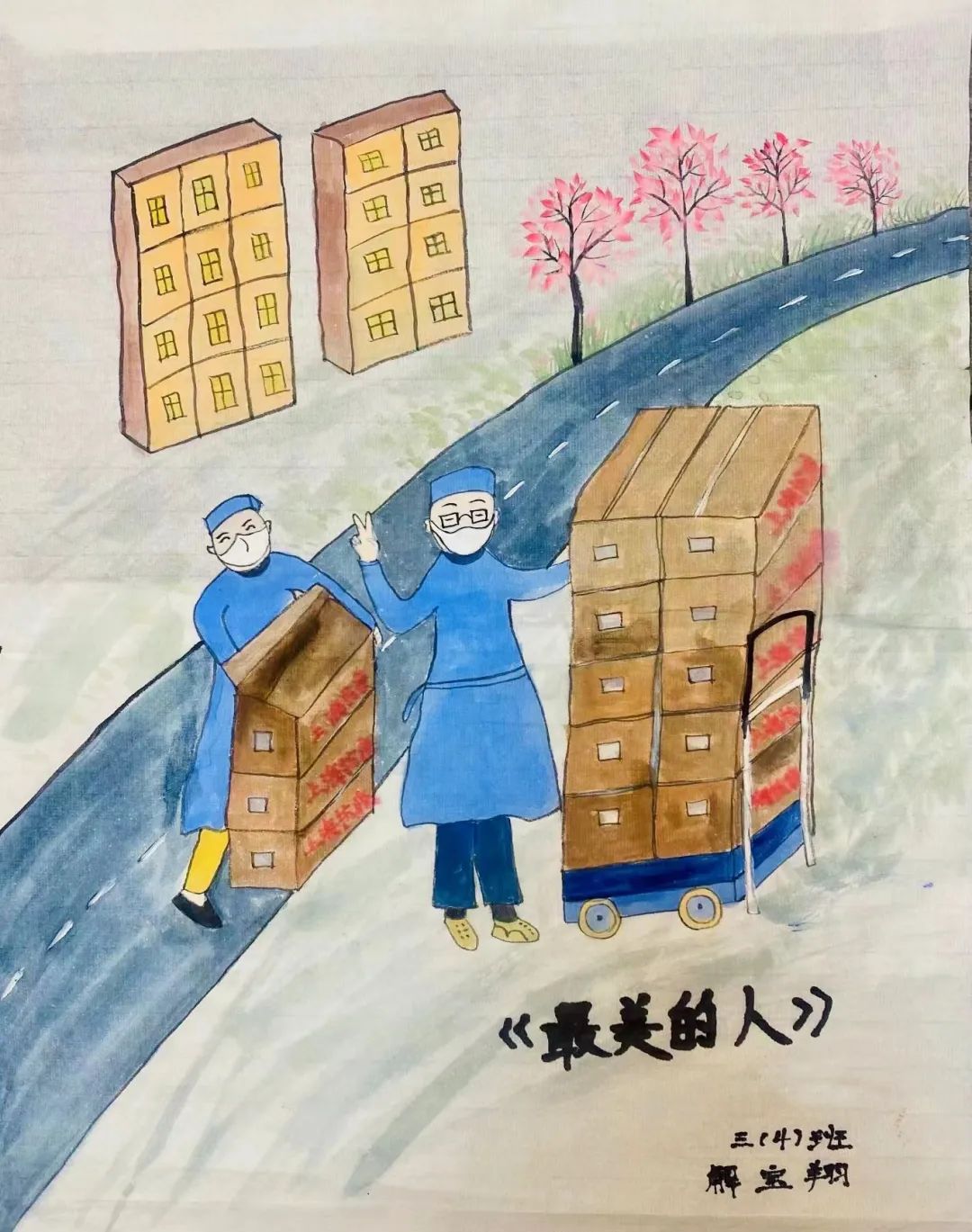 “亲爱的志愿者,感谢你们,是你们的辛苦给大家带来了温暖,将病毒隔离在了小区之外,你们是最美的人。这幅《最美的人》是我亲自画的画,送给你们”,一声感谢代表肯定,一句温暖铭记感动,一幅画卷定格大爱。