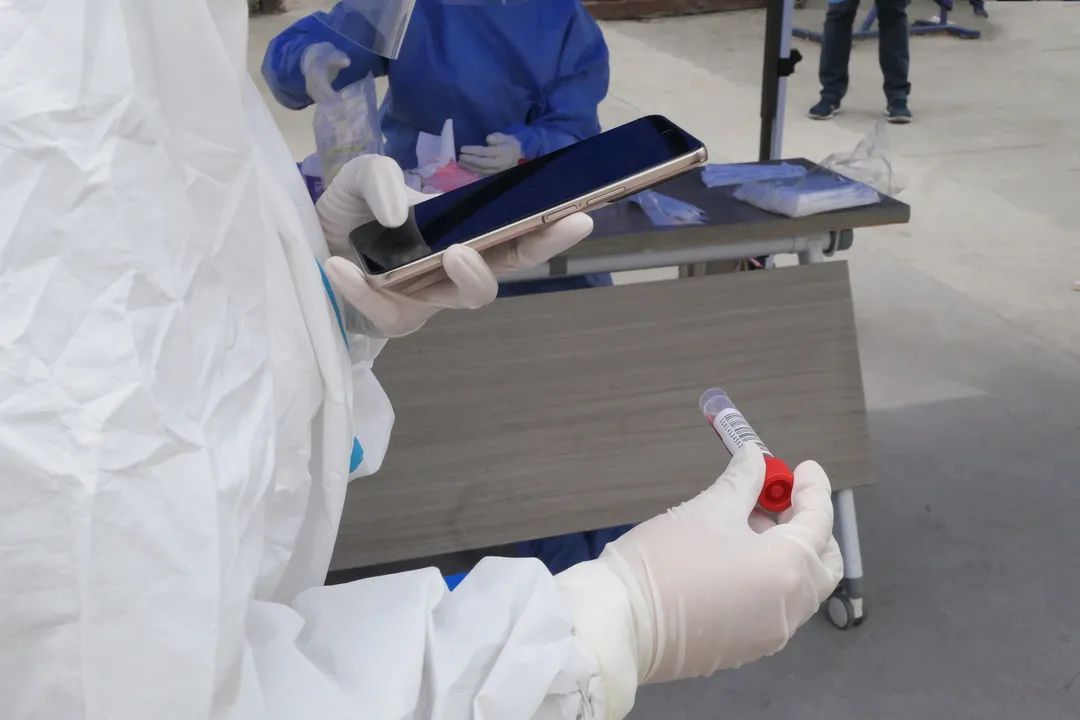 核酸采样前,工作人员会为我贴上“身份证”,方便“大白”们直接扫码采样。