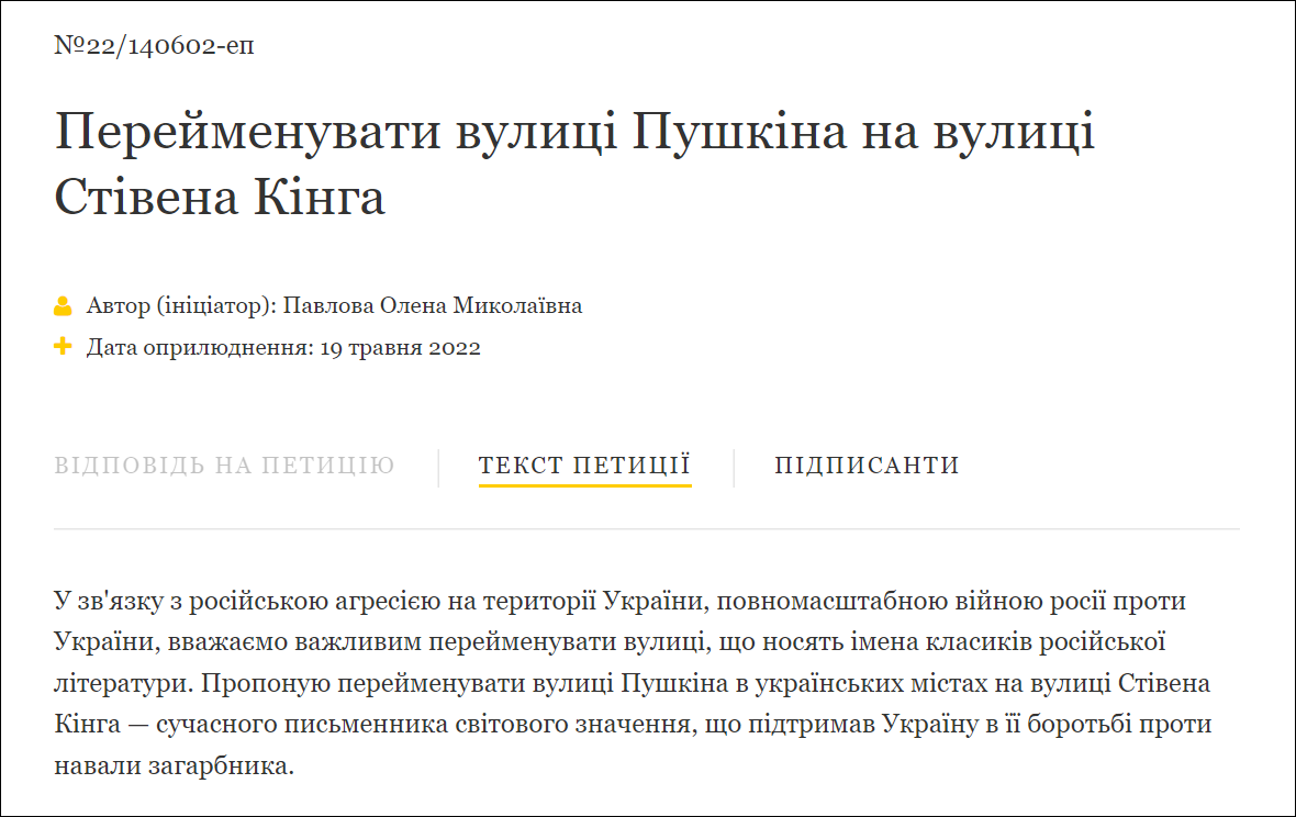 这封请愿书的作者是一位名叫巴甫洛娃·埃琳娜(Павлова Олена)的乌克兰作家,她写道:“我们认为,重新命名以俄罗斯文学经典命名的街道非常重要。我建议将乌克兰城市的普希金街道重新命名为斯蒂芬·金街。”