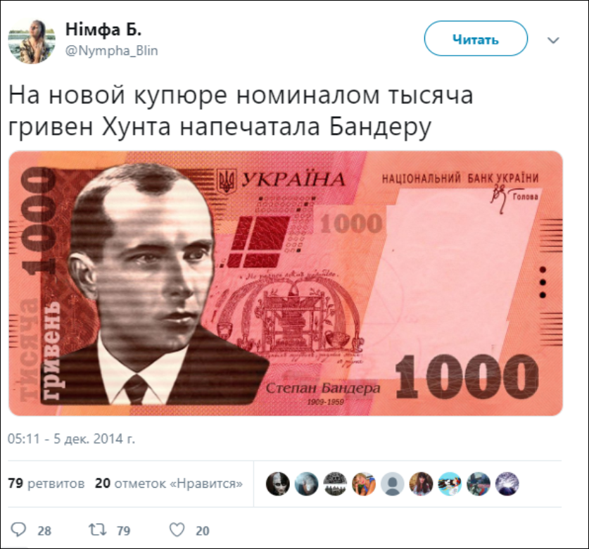 值得注意的是,这位请愿的埃琳娜曾在2014年发布了一张1000面值的格里夫纳纸币(乌克兰官方货币)图片,把二战时期乌克兰纳粹头目斯捷潘·班杰拉(Stepan Bandera)的头像P在了上面。