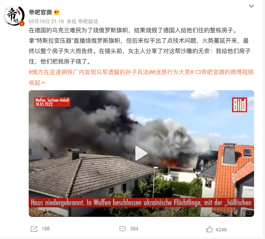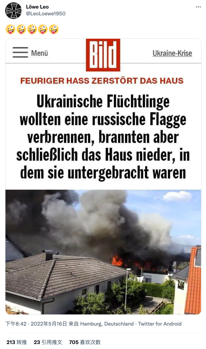 - “在德乌克兰难民烧俄罗斯国旗点燃安置房”消息不实。原视频假借《图片报》名义广为传播,但已为《图片报》副主编辟谣。