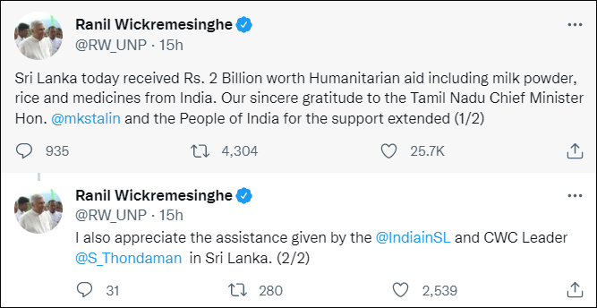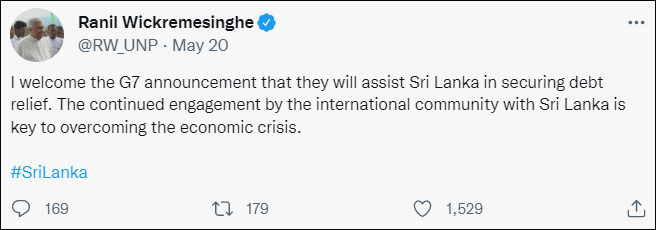 5月22日,维克勒马辛哈在推特表示,斯里兰卡当日收到了印度提供的奶粉、大米和药品等价值20亿卢比(约合3760万元人民币)的人道主义援助,并对此进行感谢。稍早前的19日,七国集团也表示支持对斯里兰卡提供债务减免。