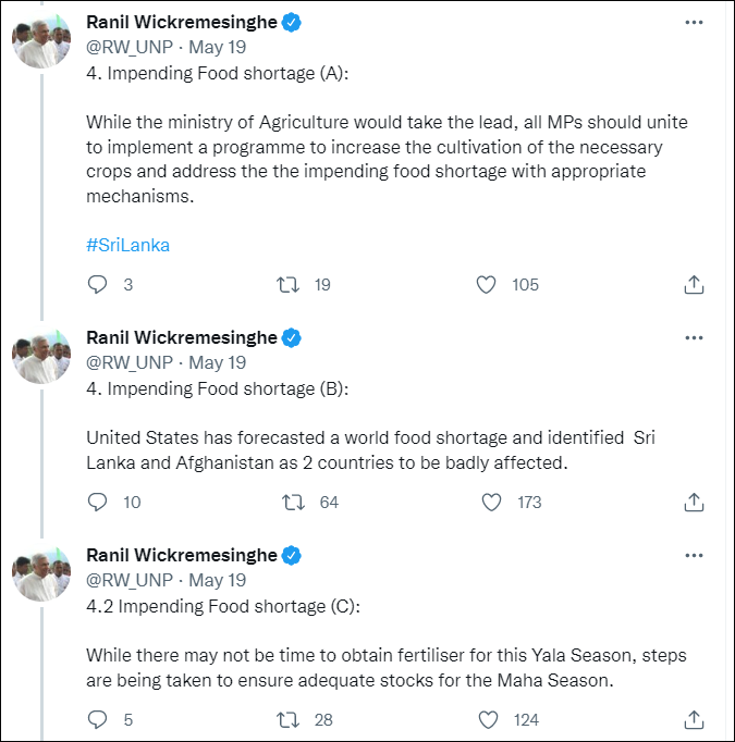 5月19日,维克勒马辛哈在推特引用美国此前作出的预测称,世界将面临粮食短缺,而斯里兰卡和阿富汗可能受到严重影响。