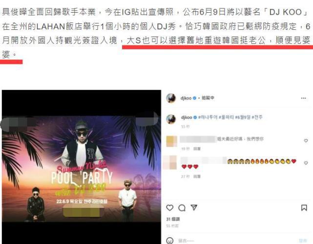 具俊晔将在韩举办泳池派对 台媒曝大S或赴韩见婆婆