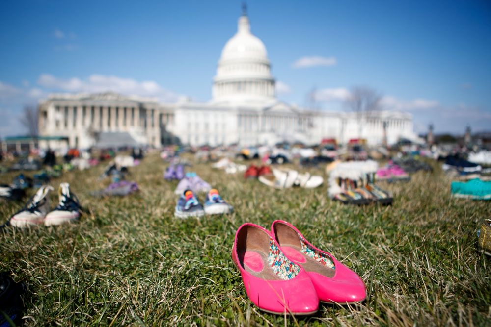2018年3月13日,7000双鞋子被摆放在美国华盛顿国会山前的草坪上,代表自2012年康涅狄格州桑迪胡克小学枪击案以来在枪击事件中遇难儿童。人们以这种无声的方式,抗议国会面对枪击事件频发现状的不作为,呼吁枪支改革以保障儿童安全。(新华社发,沈霆摄)
